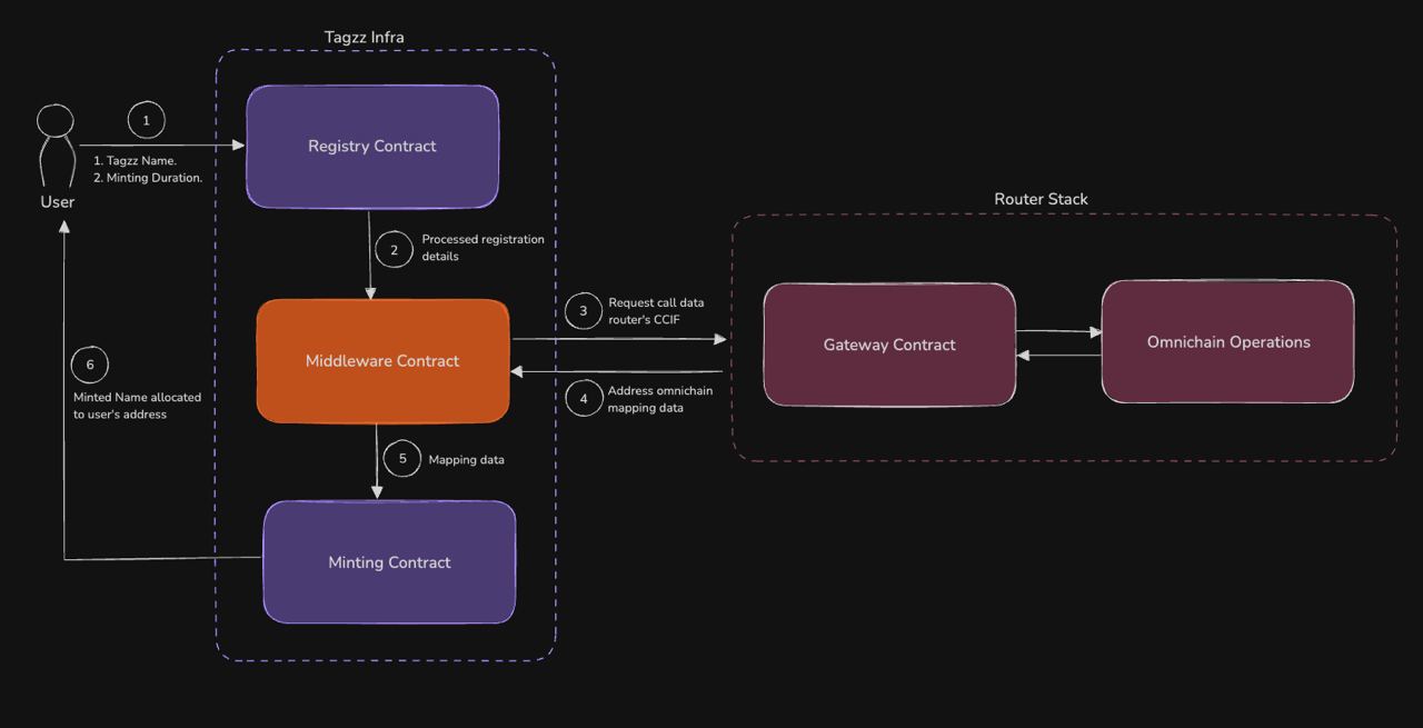 Once the middleware contracts have processed your request and validated your ownership of the username, the **Minting Contract** comes into play. This contract is responsible for minting your unique Tagzz identity and assigning it to your designated wallet address. Your Tagzz identity is essentially a digital asset that represents your omni-chain presence.